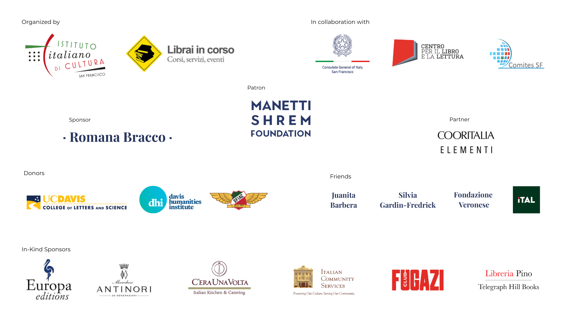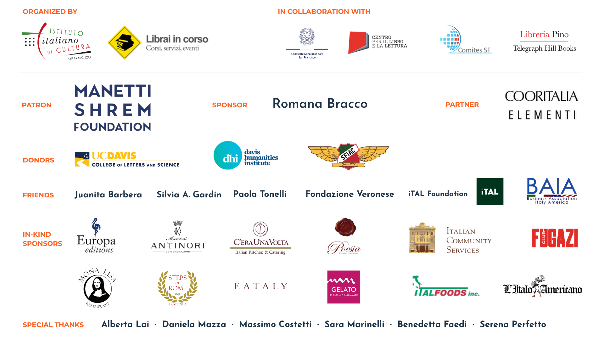 Presentato dall’Istituto Italiano di Cultura di San Francisco e da Librai in Corso, sotto gli auspici del Consolato Generale d’Italia a San Francisco e del CEPELL – Centro per il libro e la lettura, La Piazza è il primo festival letterario italiano a San Francisco a portare i più recenti scrittori italiani al pubblico della Bay Area e a celebrare la ricca tradizione letteraria del paese, condividendo le voci e i volti che definiscono la nostra cultura letteraria contemporanea.